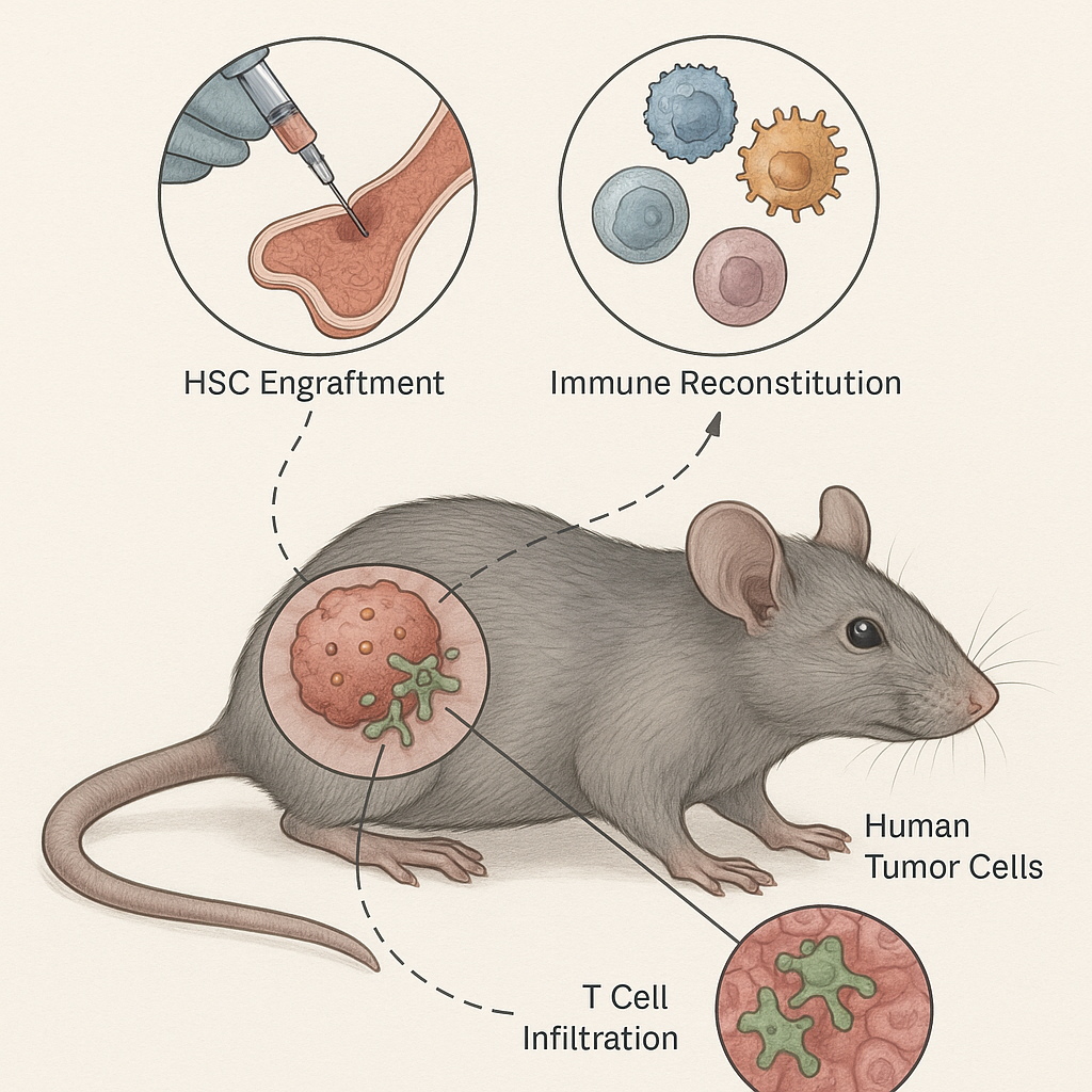 - NSG or NOG mice are irradiated and transplanted with CD34⁺ human hematopoietic stem cells (often derived from cord blood).