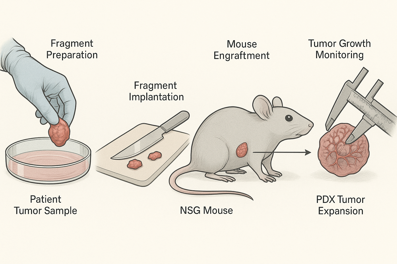 The process begins with the surgical acquisition of a primary or metastatic tumor specimen, usually under informed consent protocols. Tumor fragments (2–4 mm³) are immediately engrafted into recipient mice—commonly NSG or NOG strains—via subcutaneous or orthotopic implantation. Subcutaneous models provide ease of monitoring tumor growth, while orthotopic models replicate the native microenvironment of the tumor. Engraftment success rates depend on tumor type, aggressiveness, and stromal viability; hematological malignancies and poorly differentiated solid tumors often engraft more efficiently.