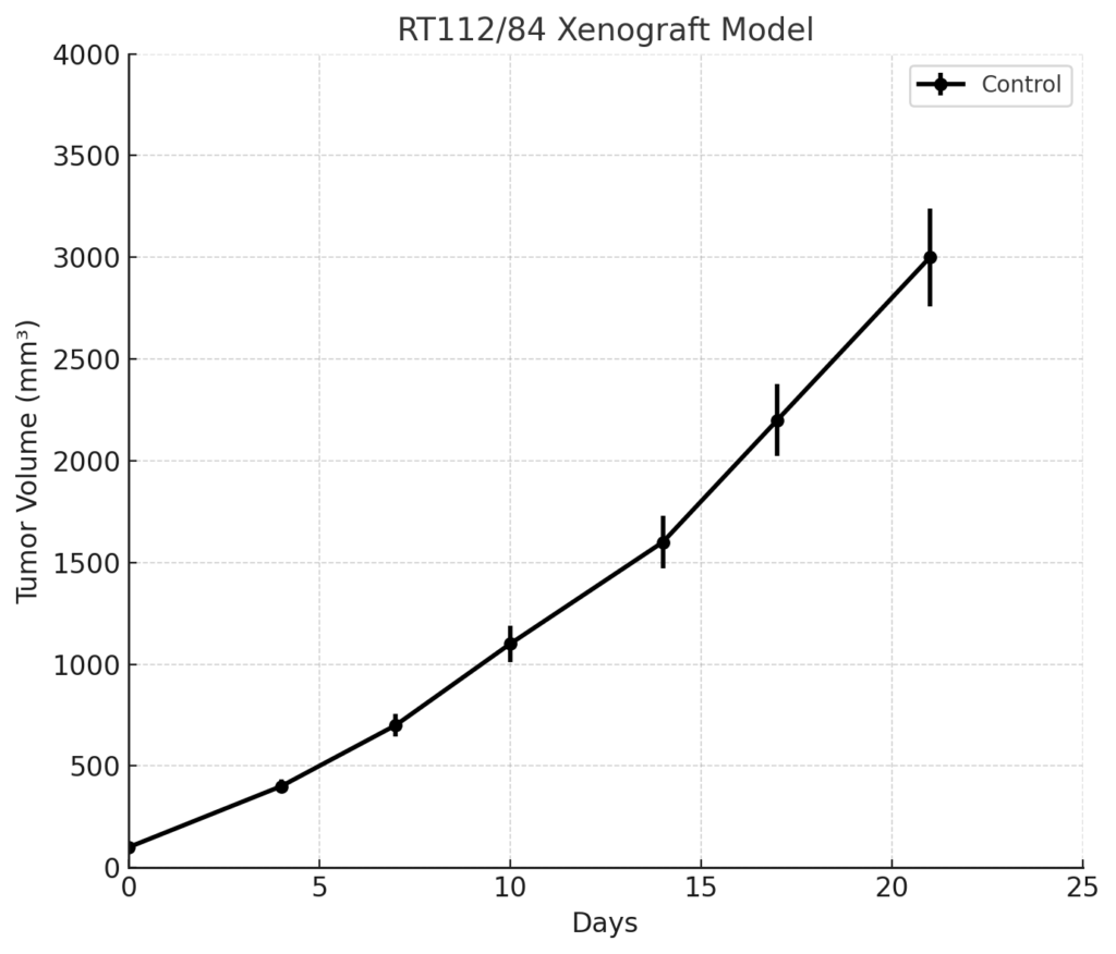 Tumors grow in a well-circumscribed, non-invasive manner and do not metastasize under standard experimental conditions. The model supports serial tumor volume measurement and endpoint tissue collection for pharmacodynamic and histological analyses. Because of its stable growth and epithelial integrity, RT112/84 is particularly well suited to testing agents that require prolonged exposure or mechanistic assessment over time.